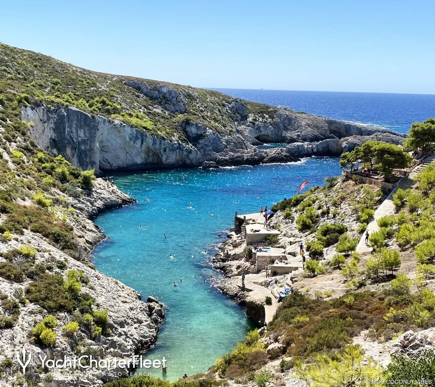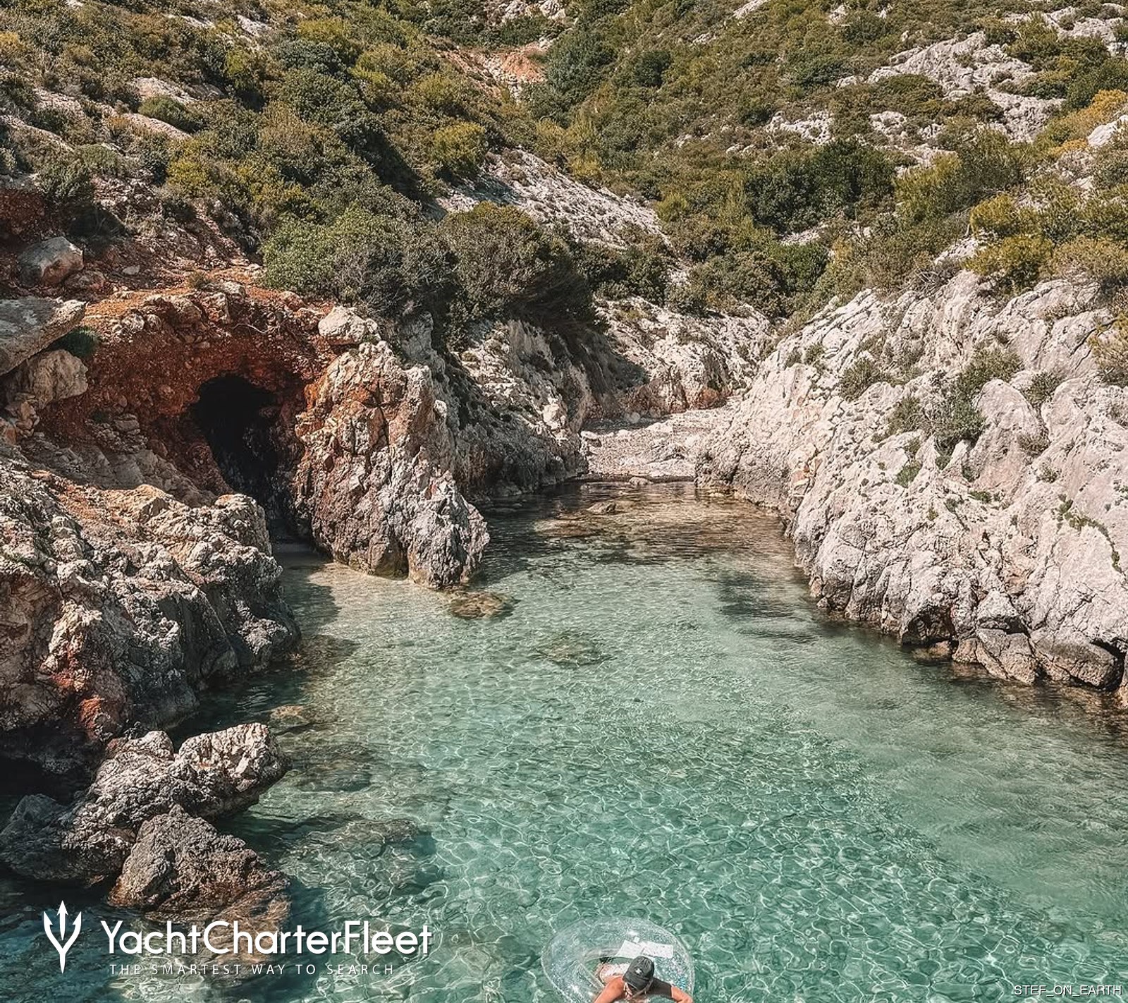Adventurous visitors on a Greece yacht charter can explore the sea caves that line the coast. The first cave is just below the entrance steps, and for those who enjoy diving and underwater exploration, it extends further beneath the cliffs. The experience is thrilling, especially for those who enjoy discovering hidden underwater passages. The contrast between the sunlit sea and the shaded cave interiors adds to the mystical charm of the area.